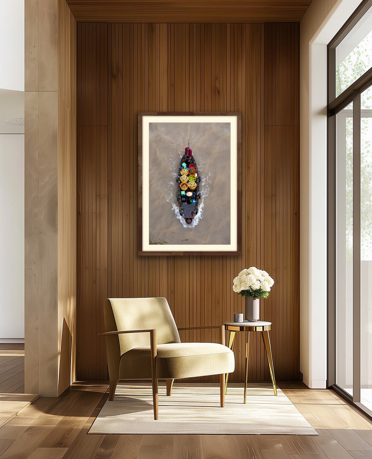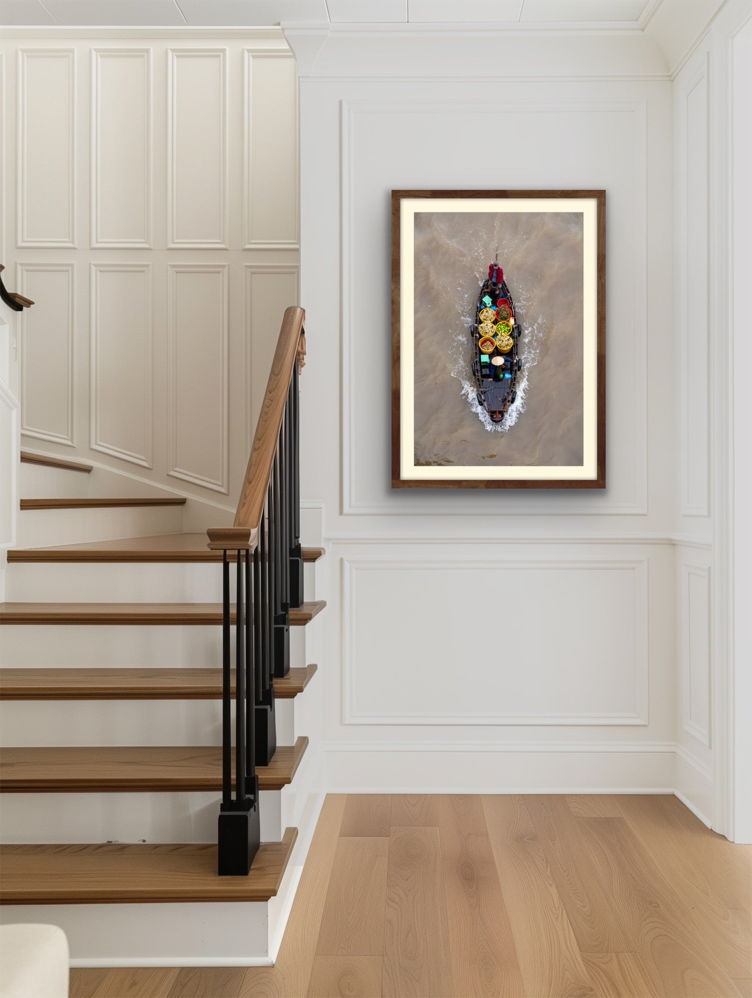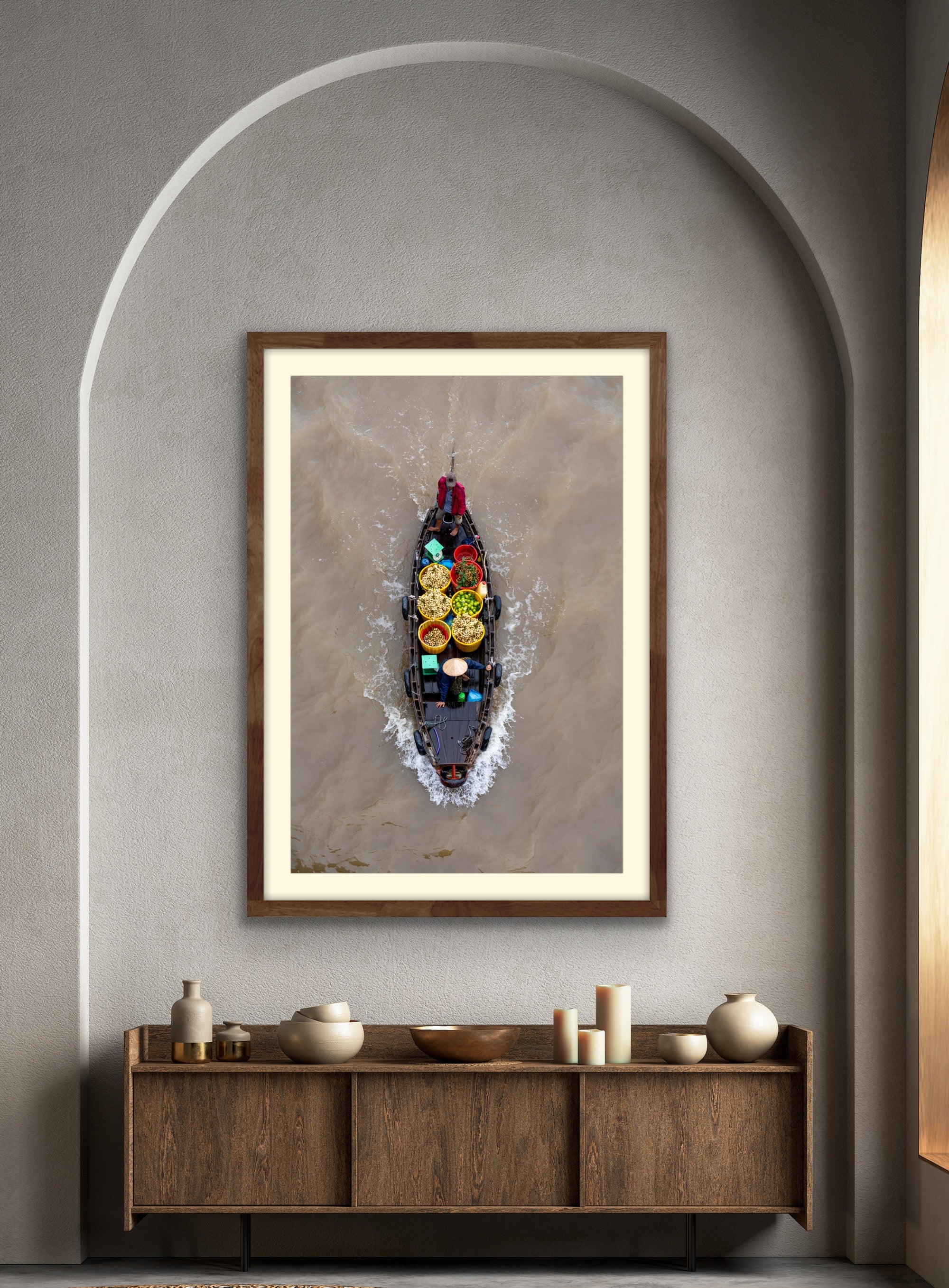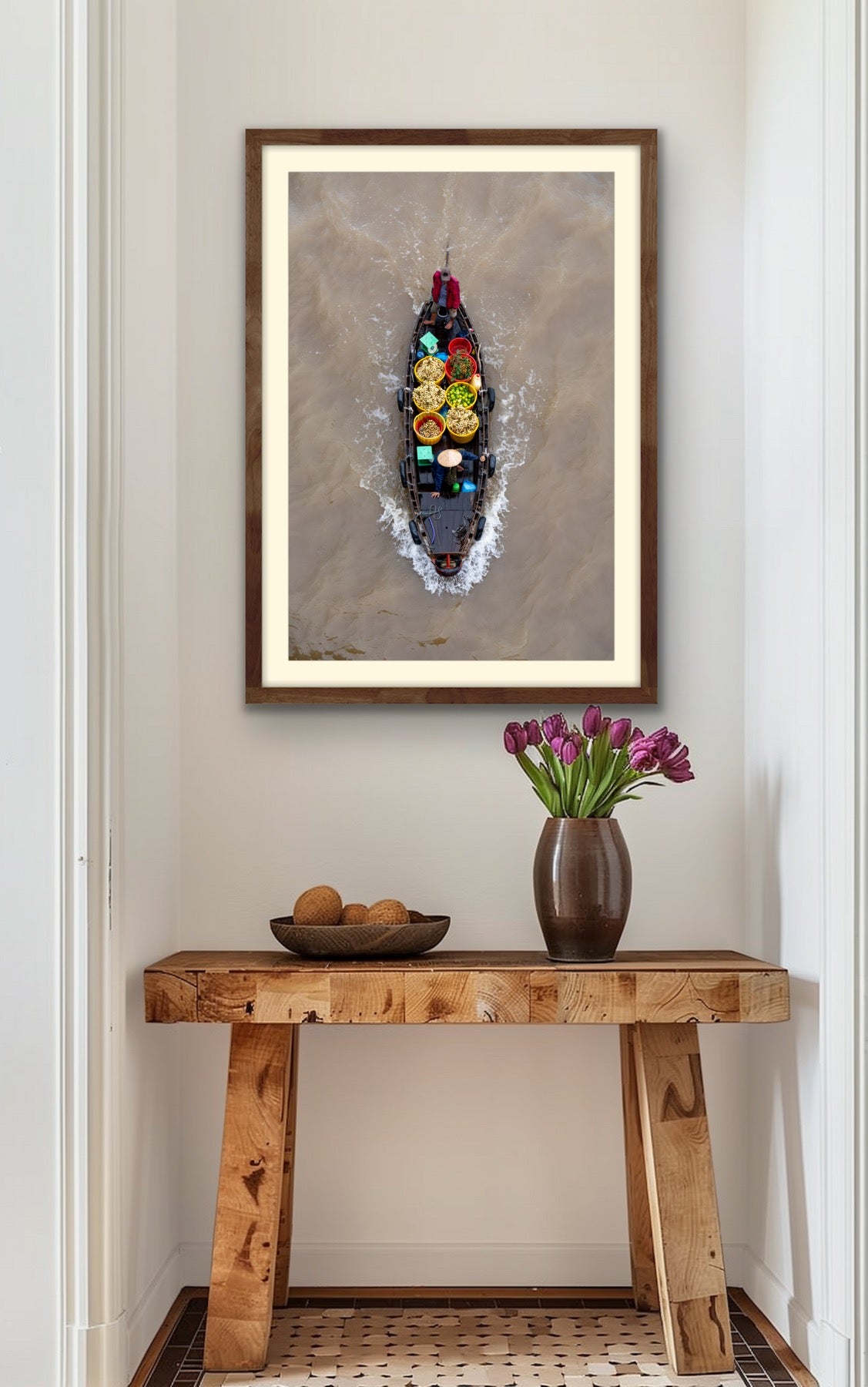 Standing atop the nearest bridge to the market, I was able to get in place to capture two fruit sellers making there way along the river. The colorful fruit and baskets makes for a great capture, along with the two green scales (for weighing produce) and the perfect stances of both workers, one looking ahead in front with the other steering in back.