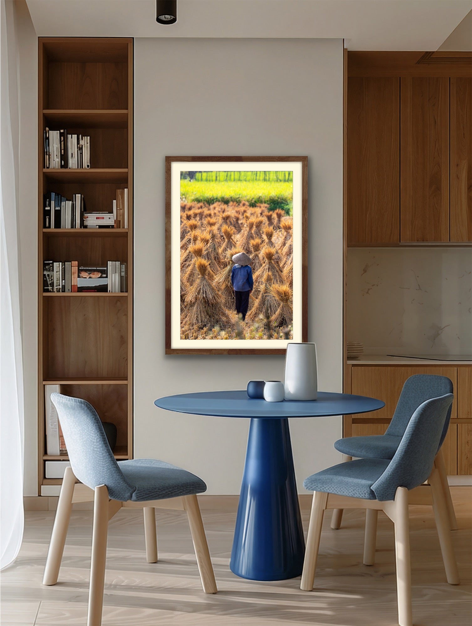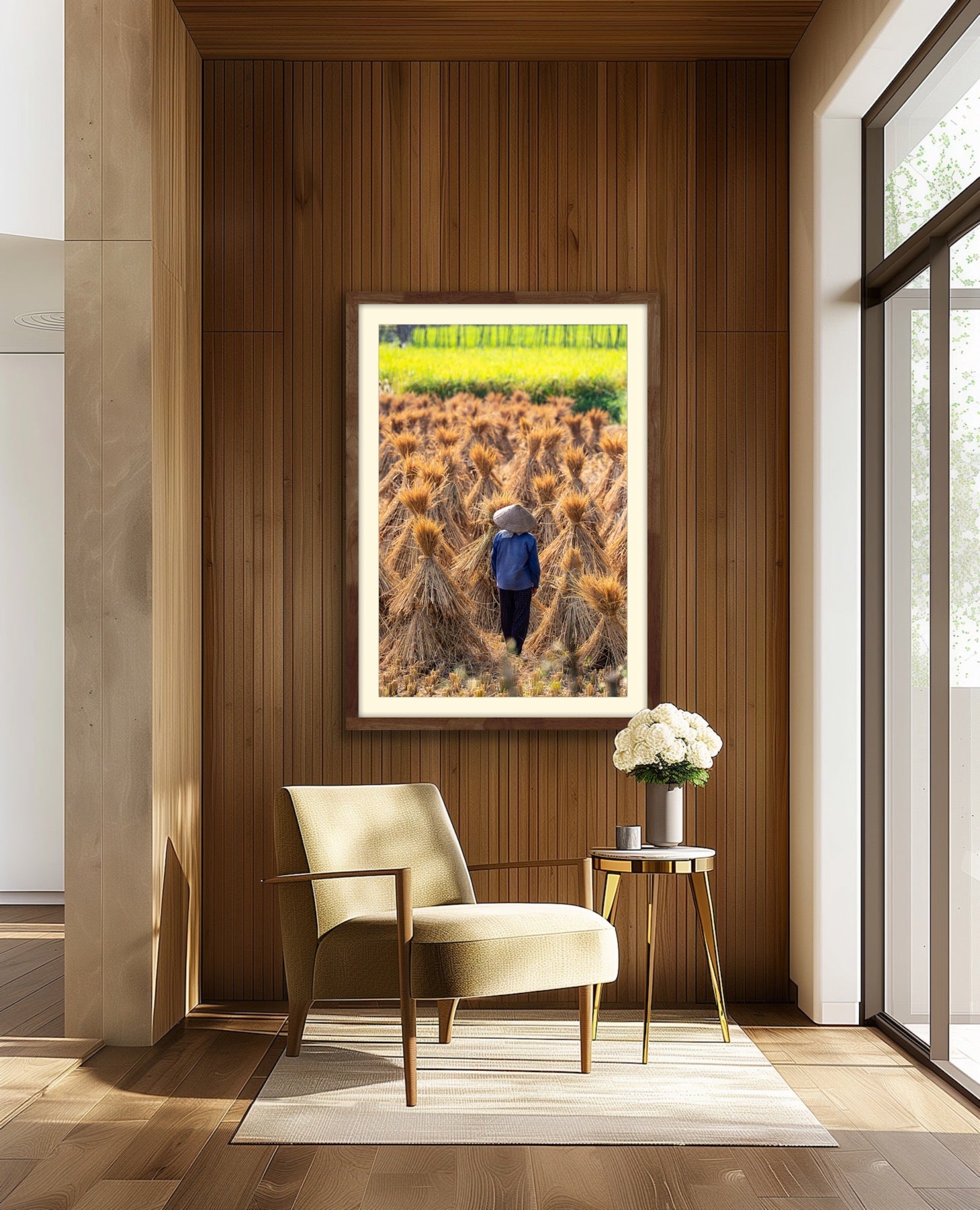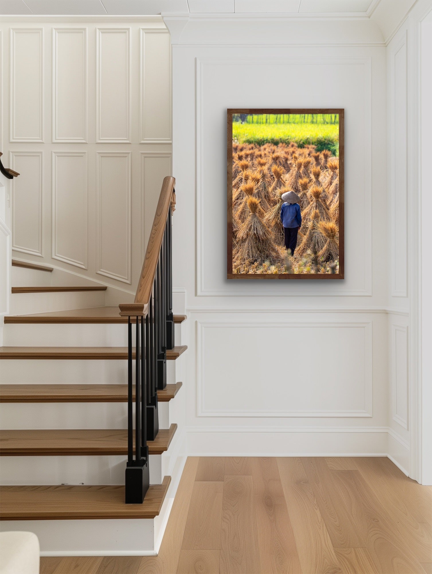The rice has already been cut, but more work remains. A woman binds cut rice stalks together, making haystacks, and stacking them one atop another in an artistic array of gold. In case it rains, this will ensure the haystacks stay dry, to be used for animal feed or bedding.